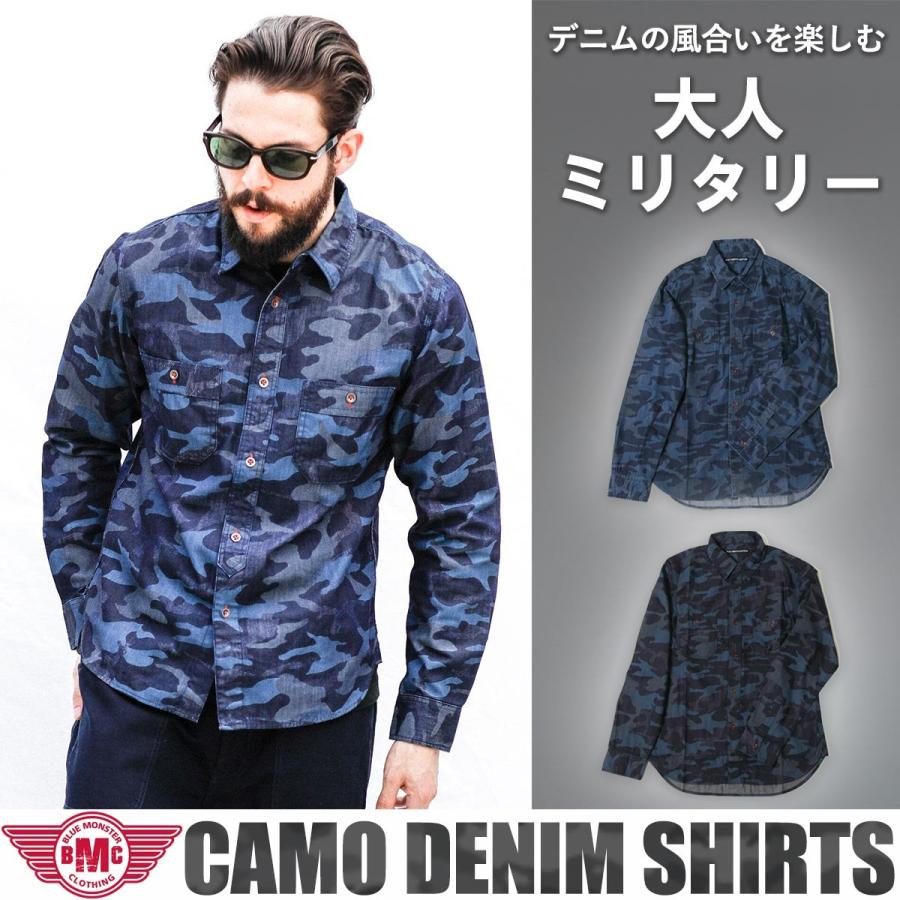 セール デニムシャツ メンズ 長袖 カモフラージュ柄 ミリタリーシャツ ワンウォッシュ ダークブルー S Xl Bmc Bmst01 Set Bmc Blue Monster Shop 通販 Yahoo ショッピング
